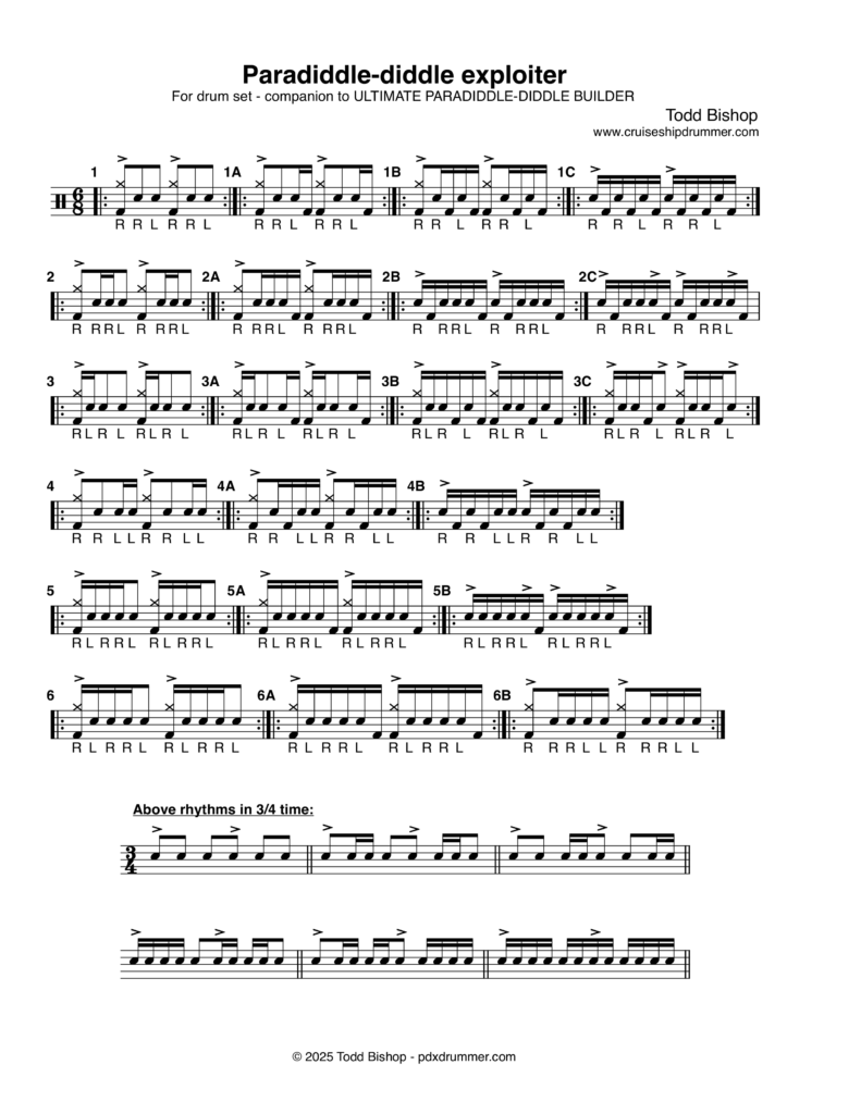 An item from my Cruise Ship Drummer! site, breaking down the paradiddle-diddle rudiment completely, and applying it to the drum set in a whole bunch of ways— there’s a lot of stuff pack into, and possible with, that one little six- note pattern.